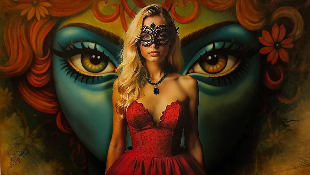 Una figura sospesa tra due mondi, quello concreto (la donna in rosso) e quello immaginario (il volto onirico e divino sullo sfondo).